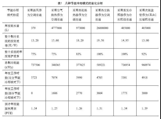 下面對幾種節(jié)能冷卻模式進行量化分析,具體情況見表1。