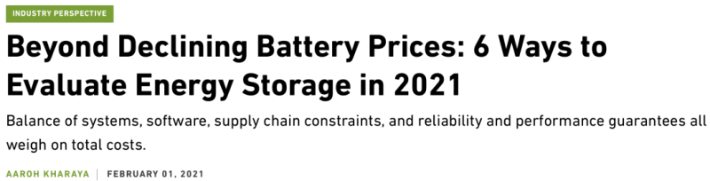 中國(guó)儲(chǔ)能網(wǎng)訊:GreenTechMedia發(fā)表電池儲(chǔ)能專(zhuān)家Aaroh Kharaya的文章,題目是:Beyond Declining Battery Prices: 6 Ways to Evaluate Energy Storage in 2021(不僅要看電池價(jià)格:2021年評(píng)估儲(chǔ)能的6種方法),副題是:系統(tǒng)平衡、軟件、供應(yīng)鏈約束、可靠性和性能保證都會(huì)影響總成本。