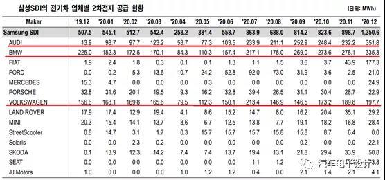 相比而言,三星SDI的增長主要是基于奧迪E- tron EV,福特Kuga PHEV和 大眾Passat GTE的銷量增長,在韓國的一份證券報告里面做了一些分解,從這個表格里來看,今年BMW I3的全球銷量不佳,提升的量主要是針對BMW在歐洲的PHEV的需求。奧迪的需求上升,主要是低容量版本的E-tron在歐洲的銷量拉升。大眾旗下大眾、斯柯達、SEAT品牌,一方面有之前小BEV的需求,一方面有PHEV的需求。福特的PHEV的需求,在中間一度拉高到92MWh,但是隨著質量召回這個數(shù)量迅速回落。從12月來看,F(xiàn)IAT拉起來的需求增加到了177MWh。 從總體來看,目前SDI主要的產(chǎn)品還是集中在PHEV上(BMW、大眾旗下的所有品牌、福特),對大眾的供應隨著MEB平臺的逐步上量,這部分供應量只能維持穩(wěn)定。在歐洲下一步BEV逐步滲透加速來看,SDI的增量相比其他幾家從能量來看會比較有限。