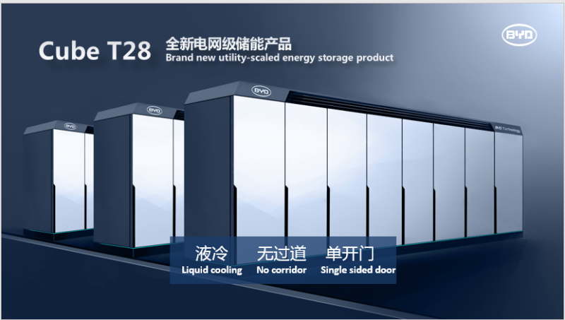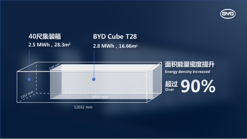 比亞迪全新電網(wǎng)級儲能產(chǎn)品BYD Cube T28,占地僅16.66平方米儲能容量2.8MWh,相較于行業(yè)內(nèi)40尺標(biāo)準(zhǔn)集裝儲能系統(tǒng)單位面積能量密度提升了超90%,率先支持1300V直流電壓,匹配不同品牌的高電壓換流器。