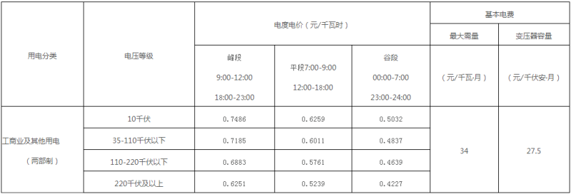 第四條 峰谷時(shí)段電價(jià)浮動(dòng)比例:高峰時(shí)段電價(jià)在平段電價(jià)基礎(chǔ)上上浮21%,低谷時(shí)段電價(jià)在平段電價(jià)基礎(chǔ)上下浮21%。