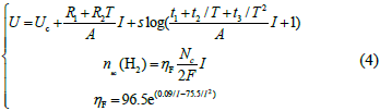 PEM電解槽由膜電極組件(MEA)、氣體擴(kuò)散層(GDL)及帶有流道的隔板(雙極板)組成。電解槽中,水經(jīng)過(guò)電解在陽(yáng)極產(chǎn)生氧氣,在陰極產(chǎn)生氫氣,因此在產(chǎn)生的氣體出口設(shè)置了流量計(jì)。典型的堿性電解槽考慮溫度影響的U-I特性曲線模型及電解槽制氫量相關(guān)模型可以用式(4)表示。