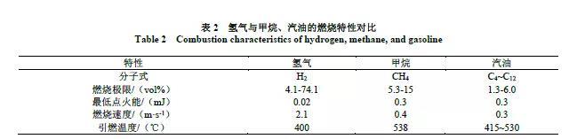 氫氣的燃燒速度很快,暴秀超等人發(fā)現(xiàn)在常溫常壓(27℃,0.1MPa)下,當燃空比為1時,氫氣的燃燒速度可達2m·s-1左右,而天然氣的燃燒速度僅為0.4m·s-1,所以氫氣常常被作為燃料的添加劑用來提升體系的層流燃燒速度。在空氣中,氫氣的燃燒范圍很寬,一般為4.1%-74.1%。另外,氫氣點火能極低,它的最小點火能量大約為0.02mJ,約為汽油的十分之一。表2列出了氫氣及一些常用燃料的燃燒特性參數(shù)。