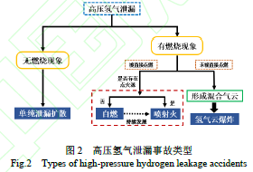 然而,安全性一直是氫能全生命周期運行的突出瓶頸問題。由以上可知,高壓又是其中最為突出的風險要素。無論是高壓制氫、高壓儲氫還是高壓運氫環(huán)節(jié),如遇到高溫、氫脆破壞或外部撞擊等,極易引發(fā)高壓氫氣的泄漏和擴散,甚至更為嚴重的火災和爆炸事故災害。根據(jù)高壓氫氣的泄漏行為,可將事故總體分為無燃燒泄漏擴散和有燃燒泄漏兩種,如圖2所示。無燃燒泄漏擴散,即高壓氫氣只發(fā)生單純的泄漏擴散,未遇點火源或發(fā)生自燃。有燃燒泄漏則可分為三種情形:一是當氫氣泄漏形成射流后,遇到點火源引發(fā)噴射火;二是雖無外部點火源,但高壓氫氣發(fā)生了自燃,并且可能發(fā)展為噴射火;三是氫氣泄漏后先是在一定空間內與空氣混合形成氣云,此時若遇到點火源,則極易發(fā)生氫氣云爆炸。僅2019年,挪威、美國就相繼發(fā)生多起氫氣爆炸,事故起因分別是氫氣云爆炸和氫氣自燃引發(fā)的連鎖爆炸,這些再一次引發(fā)公眾對氫能安全的廣泛關注、擔憂甚至恐慌。亟需對高壓氫氣的安全問題開展系統(tǒng)地研究和闡述,充分掌握事故演化規(guī)律,為氫能安全防控技術開發(fā)及安全標準制定提供科學依據(jù)和有力工具。
