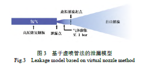 根據(jù)氣體泄漏源的壓力與環(huán)境壓力的比值,泄漏產生的氣流可分為不同的類型,而高壓儲罐/管道泄漏一般會形成高壓欠膨脹射流。Xiao等人假定存在一個氣流絕熱膨脹至大氣壓的過程(如圖3所示),在自由射流模型中引入虛擬出口,探究泄漏源附近的濃度場和速度場變化情況。Zhang 等人基于等熵膨脹過程和真實氣體狀態(tài)方程計算了出口處射流的特性參數(shù)。Zou考慮了高壓氫氣泄漏過程中的熱交換現(xiàn)象,使用范德華方程和焓方程建立HEC(熱交換)模型,并將此模型與基于等熵過程假設的模型進行比較。但現(xiàn)有的理論模型都僅對開敞空間有一定的適用性,而對受限空間以及有障礙物的情況則很難給出合理的測。