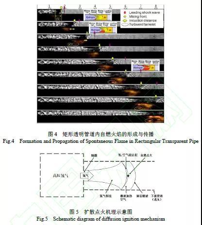 近年來,高壓氫氣泄漏自燃成為了氫安全領域的研究熱點。如Kim等人在矩形透明管道中完整記錄了自燃火焰的形成過程(如圖4所示),在氫/空氣混合層前鋒面的后方管壁上發(fā)現(xiàn)高度混合點,自燃火焰首先在該處出現(xiàn),隨后傳播至氫/空氣混合層的首尾部。