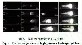 若高壓氫氣泄漏后被點燃(外部點火源或發(fā)生氫氣自燃)則很可能引發(fā)噴射火。近期,Jiang 等人利用高速照相機記錄下了管道出口處自燃火焰轉化成噴射火的全過程(如圖6),在火焰?zhèn)鞑サ某跗?,距離噴嘴一定距離處會形成馬赫盤,其背面出現(xiàn)扁平火焰,隨后噴嘴處的火焰逐漸消失,而由馬赫盤下游的火焰繼續(xù)傳播并最終形成噴射火。除了火焰?zhèn)鞑ゼ捌滢D變過程外,噴射火特性參數(shù)的影響因素也是重點研究方向。閆偉陽等人探究了不同管長和泄放壓力下噴射火尺寸及火焰尖端平均速度變化。Henriksen等人使用圖像處理工具分析了實驗結果并給出了噴嘴幾何形狀與火焰尺寸的定量關系式。Hooker等人通過改變氫氣釋放速率和排氣孔配置進行了通風罩內氫氣噴射火的實驗研究。但目前相關的實驗研究也受到尺度的限制,且較少考察環(huán)境因素、障礙物,特別是不同點火機制(明火、電火花、高溫或氫氣自燃)等的影響,實驗結果具有一定的局限。