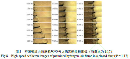 實驗研究方面,華東理工大學沈曉波團隊針對氫氣、合成氣和氫氣/甲烷等清潔燃料的預混爆炸、火焰?zhèn)鞑?、反應動力學和抑制技術等進行了系統(tǒng)的研究。他們探究了管道中氫/空氣預混火焰?zhèn)鞑バ螒B(tài)的變 化,圖8為高速紋影攝像技術所捕捉到的特殊火焰?zhèn)鞑バ袨?,他們還發(fā)現(xiàn)郁金香變形總是伴隨著火焰尖端速度的脈動。除此之外,沈曉波等人還定義了火焰形變的新階段:如T形火焰和拉伸郁金香火焰等。重慶大學余明高團隊也對氫氣、合成氣等在封閉管道中的火焰?zhèn)鞑ズ统瑝簞恿W開展了很多探索工作。