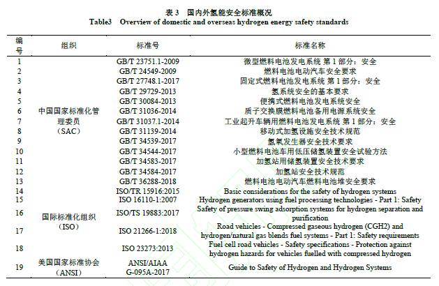 氫能領域的標準化研究對于氫能產業(yè)鏈的發(fā)展與推廣是極為重要的,因此國內外都非常重視氫能安全的標準化。國際上主要是氫能技術標準化技委會(ISO/TC197)來負責氫能相關標準制定。而中國則是在2008年成立了全國氫能標準化技委會( SAC/TC309 ) 和全國燃料電池及液流電池標準化技委會(SAC/TC342),承擔氫能的主要標準化工作。氫能安全標準化是整個氫能標準體系中很重要的一個環(huán)節(jié), 無論是制氫、儲氫、運氫還是用氫過程,都需要規(guī)范化以確保安全性。從全球范圍來看,氫能技術標準產 業(yè)中超過 50%的為氫能應用標準,而氫能安全方面的標準較少,只有不到10%。在氫能安全方面,氫能技術標準化技委會(ISO)發(fā)布了5項左右的標準,包括:氫系統(tǒng)安全標準、氫氣分離和提純的安全標準、氫燃料電池汽車安全規(guī)范等。一些發(fā)達國家在上世紀中期就意識到氫能發(fā)展的重要性,因此氫能安全標準化的制定工作也起步較早,ISO/TR 15916是國際標準化組織在 2004 年出臺的首部氫系統(tǒng)安全標準。雖然我國仍處于氫能產業(yè)發(fā)展的初期,但經過過去十多年的努力,我國氫能技術標準化工作已在全球保持領先地位。GB/T29729-2013是我國首部氫系統(tǒng)安全標準,適用于氫氣的制備、儲存和運輸系統(tǒng)。與ISO/TR15916相比,GB/T29729-2013使用范圍更廣,首次介紹了氫漿系統(tǒng)和固態(tài)氫系統(tǒng)的安全要求。表3還列出了更多的氫能領域國家安全標準,與國外同類標準相比,我國的氫能安全標準數(shù)量更多,覆蓋面更廣,基本涵蓋了所有涉及到氫能安全的場景,包括加氫站安全、燃料電池發(fā)電系統(tǒng)安全等。