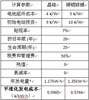 平準(zhǔn)化發(fā)電成本(LCOE)常用來(lái)分析不同發(fā)電技術(shù)在其生命周期內(nèi)的經(jīng)濟(jì)性,該方法綜合考慮了光伏電站當(dāng)前投資、運(yùn)行費(fèi)用與總發(fā)電量以及稅率和管理費(fèi)、貼現(xiàn)率等多種影響因素。通過(guò)對(duì)銅銦鎵硒薄膜太陽(yáng)能電池和晶硅太陽(yáng)能電池在分布式光伏電站的平準(zhǔn)化發(fā)電成本(*數(shù)據(jù)來(lái)自云南石林光伏電站)的分析(計(jì)算條件如列表),可以看出銅銦鎵硒薄膜太陽(yáng)能電池即使在目前其組件成本比晶硅太陽(yáng)能電池組件成本高25%的不利情況下,都比晶硅太陽(yáng)能電池在發(fā)電成本上更具優(yōu)勢(shì)。因此,隨著銅銦鎵硒薄膜太陽(yáng)能電池組件效率的大幅改善以及生產(chǎn)企業(yè)實(shí)現(xiàn)吉瓦級(jí)產(chǎn)品規(guī)模,銅銦鎵硒薄膜太陽(yáng)能電池將必然地成為光伏發(fā)電的主流產(chǎn)品。