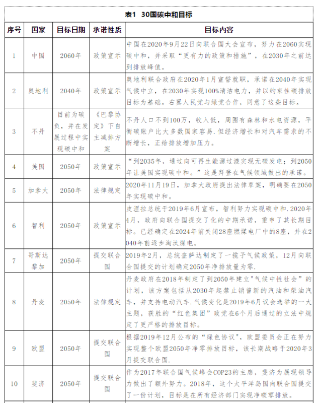 國際能源網(wǎng)通過數(shù)據(jù)整理發(fā)現(xiàn),截止目前,已經(jīng)有30個國家明確提出了碳排放目標。具體詳見表1 30國碳中和目標。