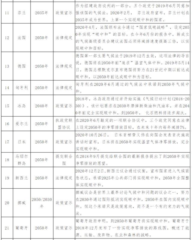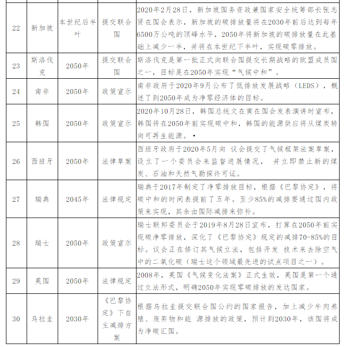 英國、歐盟、法國、德國、美國、日本、韓國、加拿大、南非等22個國家把實現(xiàn)碳中和的目標年份定在2050年。而烏拉圭(2030年)、芬蘭(2035年)、冰島(2040年)、奧地利(2040年)、瑞典(2045年)5國的碳中和目標年份是2030年-2045年,其中半數(shù)是北歐國家。新加坡則承諾將在本世紀下半葉盡快實現(xiàn)凈零排放。