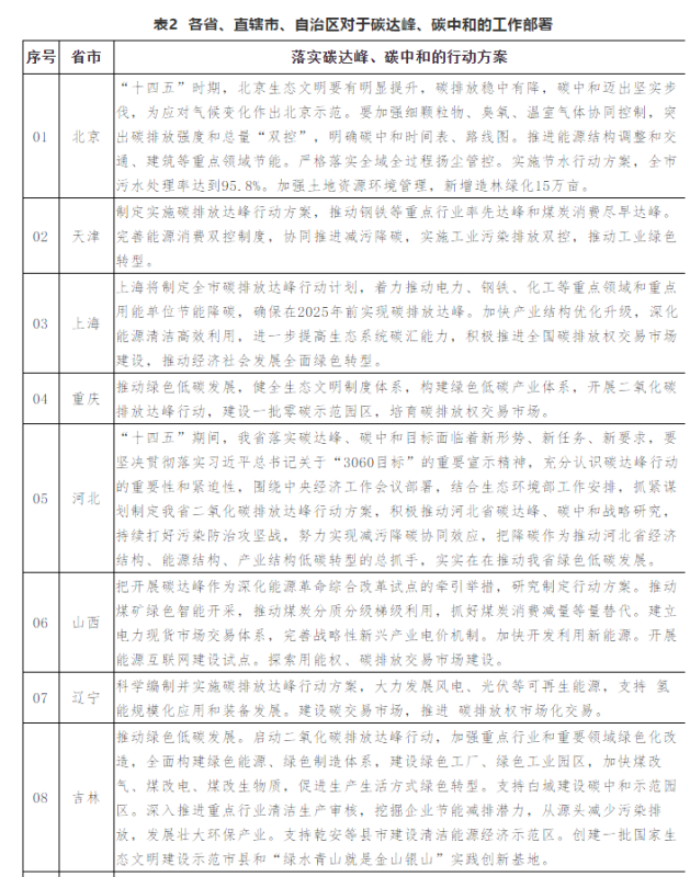 在省級層面,上海、福建、海南、青海等地提出在全國達峰之前率先達峰,天津、上海、河北、山西、江蘇、安徽、福建、江西、山東、河南、陜西、遼寧、湖北、海南、四川、甘肅、西藏共17個省、直轄市、自治區(qū)提出2021年將研究、制定實施二氧化碳排放達峰行動方案。各地2021年政府工作報告中對于實現(xiàn)碳達峰的詳細部署工作見下表2.