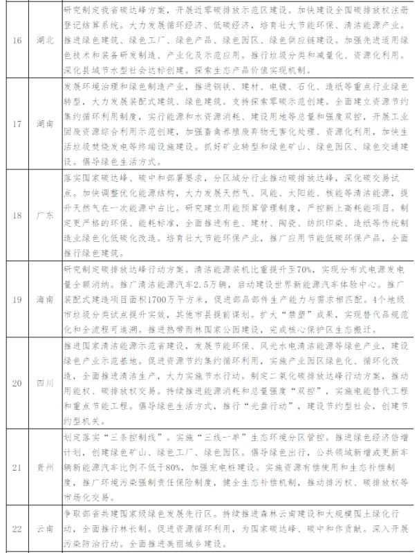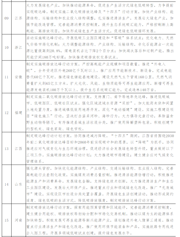 針對不同區(qū)域的局勢差異,各省都有一些特色措施。如黑龍江、江西等地以碳市場建設助力碳達峰碳中和;上海、貴州在公共領域全面推廣新能源汽車,推進充電樁、換電站、加氫站建設,倡導低碳綠色出行;山西推動煤礦綠色智能開采,推動煤炭分質分級梯級利用;浙江開展低碳園區(qū)建設和“零碳”體系試點;天津加快建設能源互聯(lián)網(wǎng),推動構建以電為中心的現(xiàn)代能源體系等。