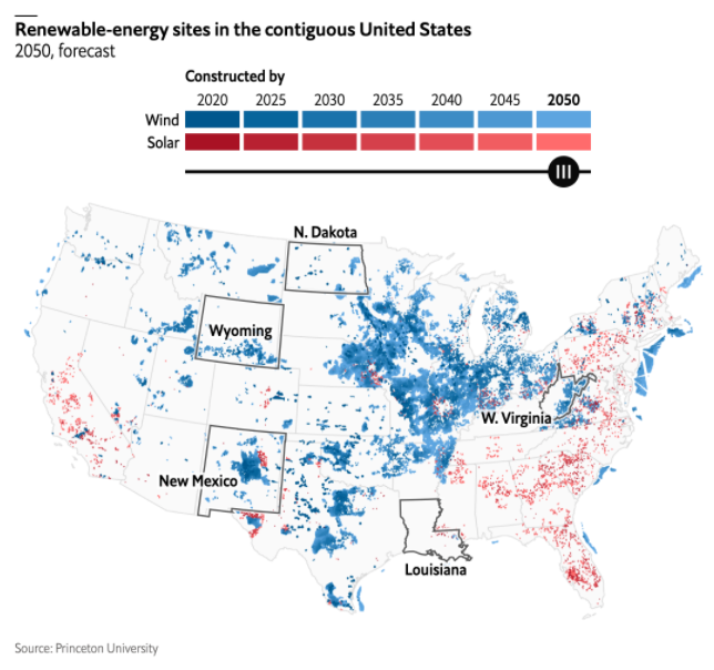 到2050年,預(yù)計(jì)美國輸電和可再生能源的將大幅度擴(kuò)張。屆時(shí),美國陸上風(fēng)電場和太陽能發(fā)電場將占地約60萬平方公里,面積略小于兩個(gè)新墨西哥州,略大于明尼蘇達(dá)州、威斯康星州和伊利諾伊州的總和。即便如此,這依然也不夠,必須加大力度探索各種能源方式的最佳組合,以提供電網(wǎng)所需的可靠容量。