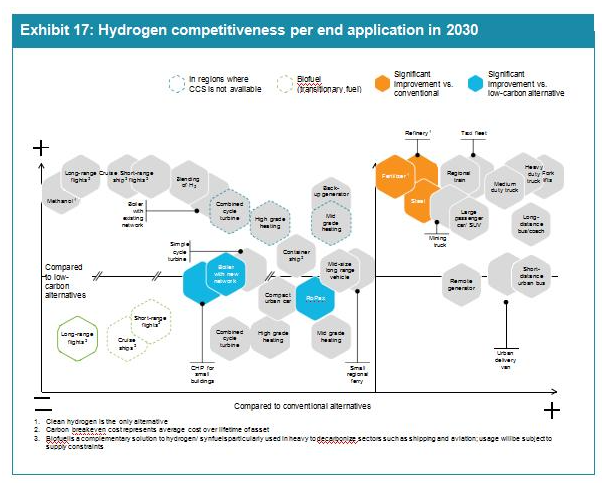 從總體擁有成本(TCO)的角度(包括制氫、分銷和零售成本)來看,氫能是22種終端應(yīng)用中最具競爭力的低碳解決方案,包括長途卡車運輸、航運和鋼鐵。然而,純TCO并不是唯一驅(qū)動因素:未來對環(huán)境法規(guī)的期望、客戶的需求和相關(guān)的“綠色溢價”,以及ESG合規(guī)投資的較低資本成本都將影響投資和購買決策。