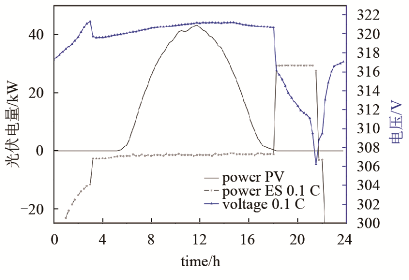 將篩選并成組后的退役動力鋰電池應(yīng)用于光儲微電網(wǎng)系統(tǒng)中,設(shè)置電池放電倍率為0.1 C,充電倍率為0.05 C,并依據(jù)當(dāng)?shù)胤骞入妰r時段進(jìn)行充放電,實(shí)現(xiàn)削峰填谷,運(yùn)行結(jié)果如圖8所示。