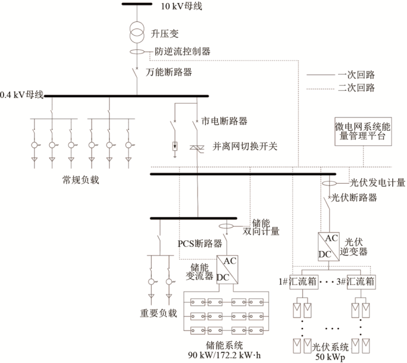 將90 kW/172.8 kW·h儲能系統(tǒng)同50 kWp分布式光伏系統(tǒng)在交流側(cè)并聯(lián),并通過快速并離網(wǎng)切換開關(guān)接入到廠區(qū)0.4 kV交流母線上,構(gòu)成光儲微網(wǎng)系統(tǒng)。其中,分布式光伏系統(tǒng)采用單晶硅組件,串聯(lián)后經(jīng)過直流匯流箱接入到組串式光伏逆變器中,與儲能系統(tǒng)在交流側(cè)耦合。儲能變流器的交流輸出端同時關(guān)聯(lián)部分重要負(fù)載,在市電異常時,由光儲系統(tǒng)保障重要負(fù)載的供電。光儲系統(tǒng)拓?fù)鋱D如圖6所示。