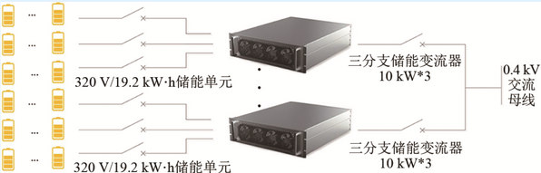 選用多通道儲能變流器作為光儲電站中的交直流轉(zhuǎn)換設(shè)備,其具有DC/DC+DC/AC兩級式拓?fù)浣Y(jié)構(gòu),在電池端無并聯(lián),可以避免電池組間環(huán)流的產(chǎn)生,適用于對退役電池進(jìn)行成組。將配組完的80 V-60 A·h電池包4個組成一串,形成320 V/19.2 kW·h儲能單元,接入到30 kW儲能變流器的一個直流通道,單個通道功率10 kW。整個儲能系統(tǒng)共9個直流通道,儲能容量90 kW/172.8 kW·h。系統(tǒng)結(jié)構(gòu)如圖5所示。