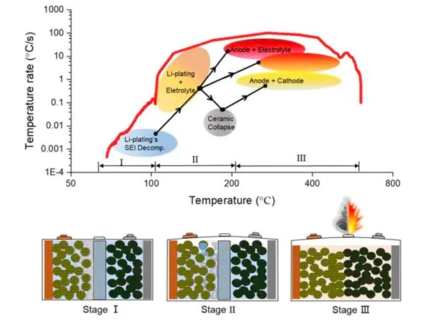 熱失控由一系列的鏈反應(yīng)引起。新鮮電池的熱失控通常是由短路引起的,隨后電解液發(fā)生反應(yīng),電池溫度達(dá)到最高。而快充后的電池?zé)崾Э剡^程可以分為三個(gè)階段,如圖10所示。第一階段(60℃ < T< 110℃),析出的鋰與電解液反應(yīng)加熱電池,SEI膜不斷破裂與再生,此時(shí)溫度相對(duì)較低。第二階段(熱失控誘發(fā)階段),鋰金屬在與電解液的反應(yīng)中被大量消耗,造成溫度急劇升高。隔膜收縮,正負(fù)極接觸。第三階段(熱失控至最高溫度),由于溫度突然升高,正負(fù)極與電解液及正負(fù)極之間開始發(fā)生反應(yīng)。最終電池溫度達(dá)到最高并發(fā)生熱失控。