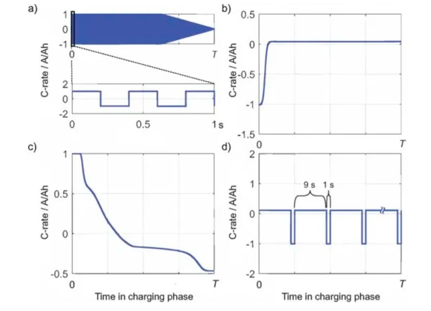 脈沖充電過程中,電流呈現(xiàn)周期性的變化,以降低濃差極化,避免局部電位變負(fù)或降低因局部鋰離子脫嵌造成的機(jī)械應(yīng)力增加。