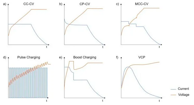 許多研究提出調(diào)整充電過程的電流可以減緩電池的老化同時(shí)減少充電時(shí)間。這些研究的目的經(jīng)常是減少產(chǎn)熱,避免析鋰或者減少機(jī)械應(yīng)力。MCC是最早用于快充的策略之一,它包含了兩步或多步的恒流階段,后伴隨著一個(gè)恒壓階段。由于開始充電的負(fù)極電位不容易下降到析鋰電位,因此早期的CC階段電流較大。但是一些研究者采取相反,即CC段電流逐漸增大的充電策略,這是因?yàn)殡姵貎?nèi)阻會(huì)逐漸降低。
