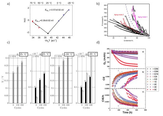 無損的析鋰觀測技術(shù)對(duì)于實(shí)際的電池應(yīng)用很重要。一般可用于析鋰表征的檢測包括SEM,TEM,NMR和XRD等,但這些手段都需要對(duì)電池進(jìn)行破壞或使用特殊電池構(gòu)型。常用的無損析鋰觀測利用電池的外部特性,包括老化速率,鋰回嵌的電壓平臺(tái),模型預(yù)測等方法。如圖6所示,基于老化特征的析鋰檢測手段包括(a)阿倫尼烏斯方程,(b)衰減過程的容量和阻抗變化分析,(c)非線性頻域響應(yīng)分析和(d)庫倫效率分析。