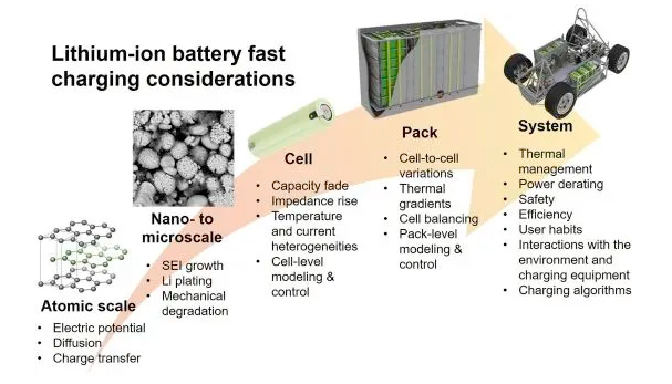 盡管提高電動(dòng)車充電功率的研究已有較大進(jìn)展,但這些快充技術(shù)并不在所有情況下適應(yīng)。根據(jù)電動(dòng)車的特定工況和充電環(huán)境,持續(xù)充電過程中,充電功率會(huì)逐漸衰減。此外,快充模式下,由于安全等因素限制,電池通常只能充至80%的電量;更高電量下,充電倍率會(huì)逐漸減小以避免過充。此外,充電功率還受到電池管理系統(tǒng)(BMS)的限制。工業(yè)界對(duì)電池快充領(lǐng)域的興趣越來越濃厚,理解清楚不同充電方法的決速步驟及其對(duì)電池壽命的影響十分必要。本文旨在從快速充電的多尺度和多學(xué)科特性出發(fā),建立微觀過程、材料特性、電池及Pack設(shè)計(jì)和充電策略優(yōu)化之間的聯(lián)系。