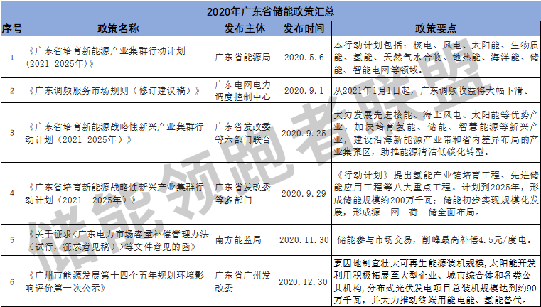 當(dāng)然,廣東省儲能產(chǎn)業(yè)的蓬勃發(fā)展,離不開儲能政策的推動。據(jù)EESA不完全統(tǒng)計,2020年廣東省共頒布6條與儲能相關(guān)性地方政策,通過地方性政策明確支持新能源與儲能的一體化建設(shè)。