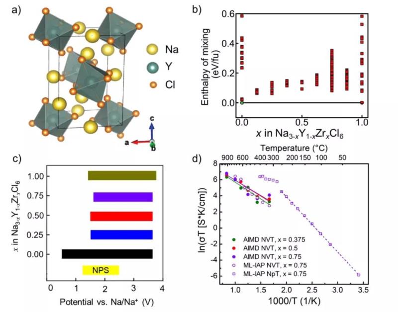 通過在計算和實驗間快速迭代,加州大學(xué)圣地亞哥分校的研究人員確定了一類由鈉、釔、鋯和氯化物組成的鹵化鈉導(dǎo)體,并將其命名為NYZC。它不僅具有電化學(xué)穩(wěn)定性,還可與高壓鈉離子電池中使用的氧化物陰極化學(xué)相容。隨后,該小組與加利福尼亞大學(xué)圣塔芭芭拉分校的研究人員共同研究這種新材料的結(jié)構(gòu)特性和性能。
