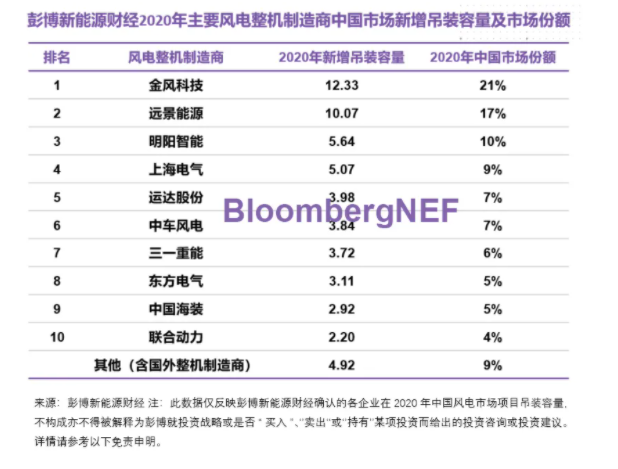 在數(shù)據(jù)統(tǒng)計過程中,彭博新能源財經(jīng)向整機(jī)制造商提供其2020年實現(xiàn)吊裝的項目清單,整機(jī)制造商均有權(quán)檢驗,確認(rèn)和增補(bǔ)各自項目清單。彭博新能源財經(jīng)針對整機(jī)制造商提交的項目清單逐個比對確認(rèn)。與彭博新能源財經(jīng)所掌握信息不符的吊裝容量均已剔除,已于2020年之前統(tǒng)計過吊裝容量的均不重復(fù)統(tǒng)計。未于數(shù)據(jù)收集截止日期前反饋信息的整機(jī)制造商吊裝數(shù)據(jù)以彭博新能源財經(jīng)數(shù)據(jù)為準(zhǔn)。彭博新能源財經(jīng)發(fā)布的最終吊裝容量與整機(jī)制造商自報數(shù)據(jù)可能存在差異。