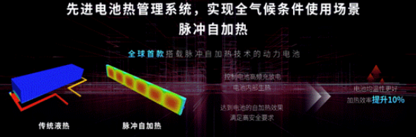專用刀片電池“自發(fā)熱,不懼寒冬”的亮點(diǎn)同樣值得稱道,其采用的脈沖自加熱和冷媒直冷熱管理技術(shù)全球領(lǐng)先,實(shí)現(xiàn)全氣候條件使用場景。脈沖自加熱技術(shù)屬全球首創(chuàng),可通過電池高頻充放電達(dá)到提升電池溫度的目的,電芯自身發(fā)熱的均溫性更好,在寒冷的東北地區(qū)也可使用。