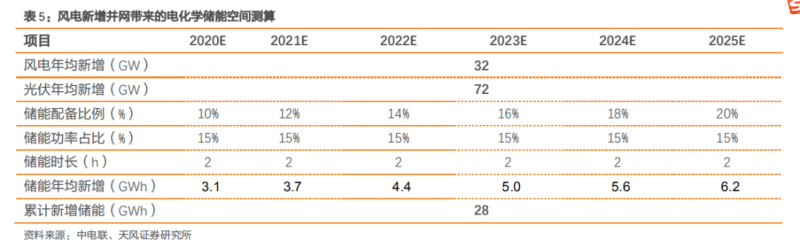 在能源結(jié)構(gòu)轉(zhuǎn)型,新能源裝機高增,各地政府要求配置儲能的背景下,我們對我國新能源并網(wǎng)帶來的儲能空間進(jìn)行測算。預(yù)計 2020-2025 年間,風(fēng)電、光伏并網(wǎng)帶來的新增儲能需求合計為 28GWh,年均新增儲能需求為 4.7GWh。測算假設(shè):①新增裝機:根據(jù)表 3 的測算結(jié)果,假定 2020-2025 年,風(fēng)電光伏新增裝機呈線性增長,每年合計新增裝機規(guī)模 104GW;②儲能配比率:從 2020 年各地要求的儲能配比率來看,最低配比要求 5%,最高配比要求 20%。我們假定 2020 年實現(xiàn)配比率 10%,以后每年配比率逐漸上升 2pct,至 2025 年實現(xiàn)配比率 20%;③儲能功率占比:根據(jù)現(xiàn)有儲能項目功率配比情況,假設(shè)為 15%;④儲能時長:按 2h 的平均備電時長作為估算值。