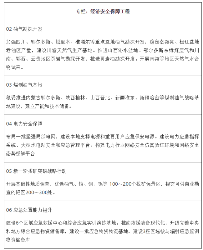 實(shí)施能源資源安全戰(zhàn)略:堅(jiān)持立足國內(nèi)、補(bǔ)齊短板、多元保障、強(qiáng)化儲(chǔ)備,完善產(chǎn)供儲(chǔ)銷體系,增強(qiáng)能源持續(xù)穩(wěn)定供應(yīng)和風(fēng)險(xiǎn)管控能力,實(shí)現(xiàn)煤炭供應(yīng)安全兜底、油氣核心需求依靠自保、電力供應(yīng)穩(wěn)定可靠。夯實(shí)國內(nèi)產(chǎn)量基礎(chǔ),保持原油和天然氣穩(wěn)產(chǎn)增產(chǎn),做好煤制油氣戰(zhàn)略基地規(guī)劃布局和管控。擴(kuò)大油氣儲(chǔ)備規(guī)模,健全政府儲(chǔ)備和企業(yè)社會(huì)責(zé)任儲(chǔ)備有機(jī)結(jié)合、互為補(bǔ)充的油氣儲(chǔ)備體系。加強(qiáng)煤炭儲(chǔ)備能力建設(shè)。完善能源風(fēng)險(xiǎn)應(yīng)急管控體系,加強(qiáng)重點(diǎn)城市和用戶電力供應(yīng)保障,強(qiáng)化重要能源設(shè)施、能源網(wǎng)絡(luò)安全維護(hù)。多元拓展油氣進(jìn)口來源,維護(hù)戰(zhàn)略通道和關(guān)鍵節(jié)點(diǎn)安全。培育以我為主的交易中心和定價(jià)機(jī)制,積極推進(jìn)本幣結(jié)算。加強(qiáng)戰(zhàn)略性礦產(chǎn)資源規(guī)劃管控,提升儲(chǔ)備安全保障能力,實(shí)施新一輪找礦突破戰(zhàn)略行動(dòng)。