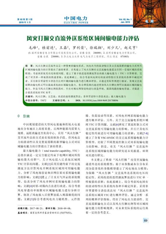 毛峰, 桂前進, 王磊, 等. 風火打捆交直流外送系統(tǒng)區(qū)域間輸電能力評估[J]. 中國電力, 2019, 52(1): 69-75.