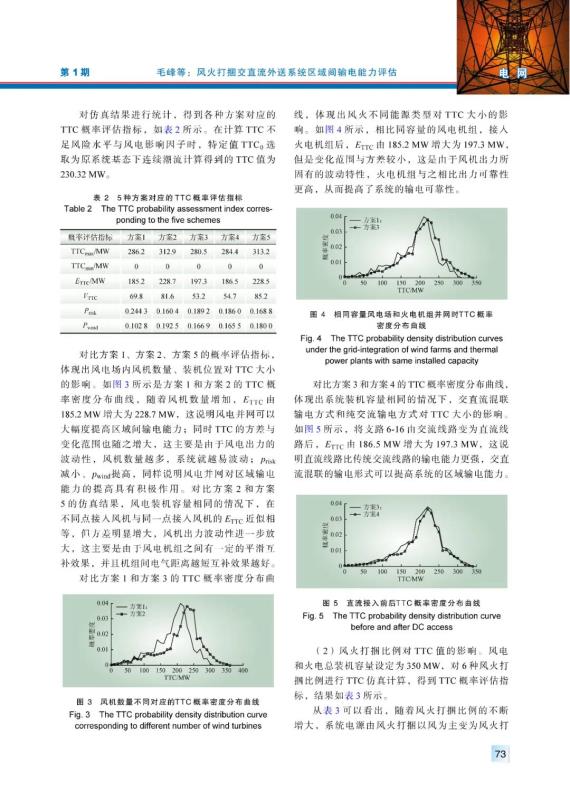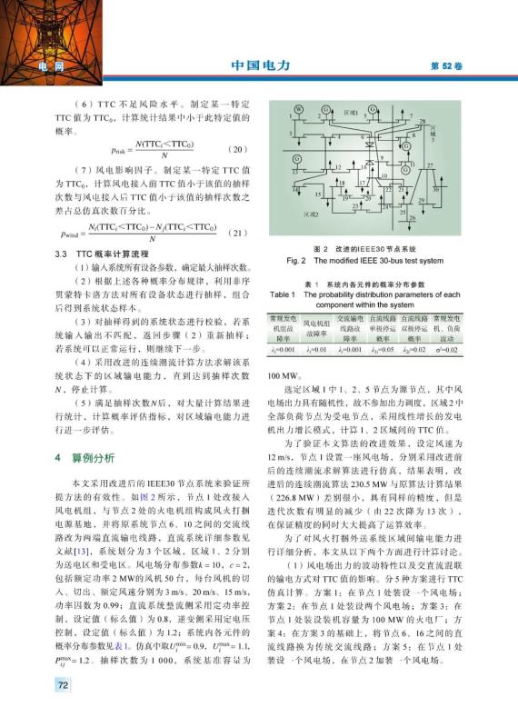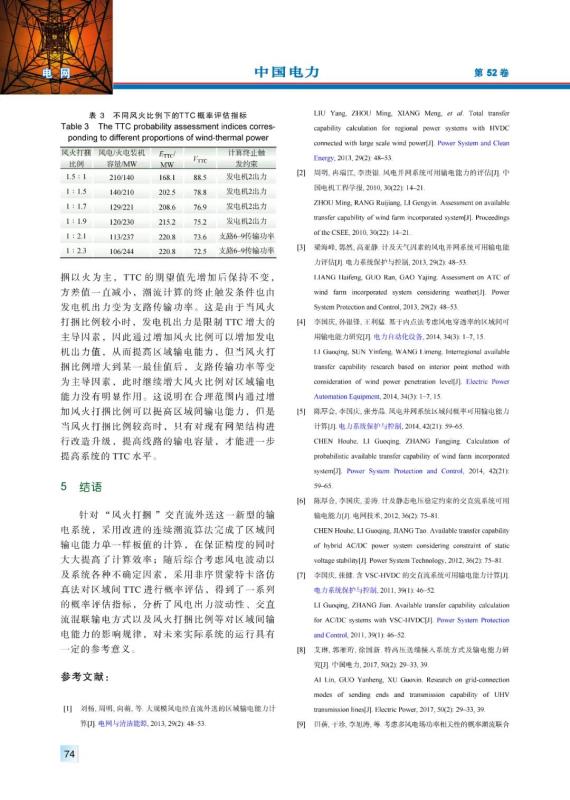結(jié)論:針對 “風火打捆 ”交直流外送這一新型的輸電系統(tǒng),采用改進的連續(xù)潮流算法完成了區(qū)域間輸電能力單一樣板值的計算,在保證精度的同時大大提高了計算效率;隨后綜合考慮風電波動以及系統(tǒng)各種不確定因素,采用非序貫蒙特卡洛仿真法對區(qū)域間TTC進行概率評估,得到了一系列的概率評估指標,分析了風電出力波動性、交直流混聯(lián)輸電方式以及風火打捆比例等對區(qū)域間輸電能力的影響規(guī)律,對未來實際系統(tǒng)的運行具有一定的參考意義。