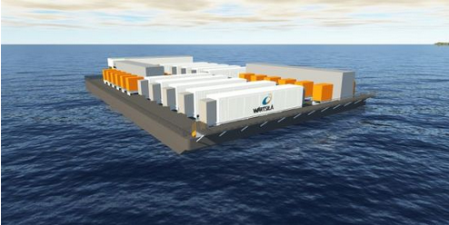 瓦錫蘭浮動駁船電池儲能解決方案渲染圖,部署的54MW/32MWh儲能系統(tǒng)將為電力駁船的柴油發(fā)電平臺提供輔助服務(wù)