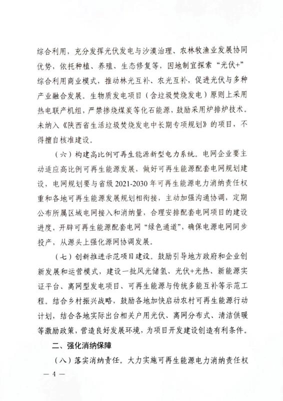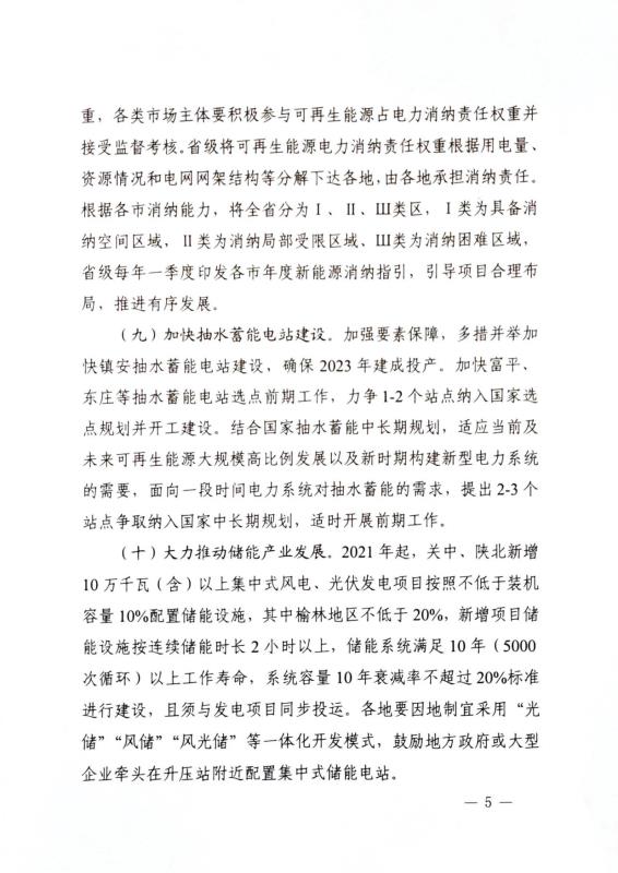 文件指出,陜西省將按照“關(guān)中優(yōu)先發(fā)展、陜北配套發(fā)展、陜南生態(tài)發(fā)展”的原則,“十四五”期間可再生能源總量消納責(zé)任權(quán)重每年提升1.5個(gè)百分點(diǎn)左右,實(shí)行可再生能源倍速發(fā)展計(jì)劃。