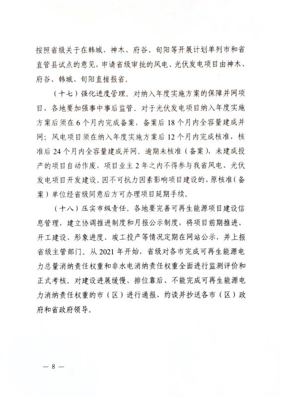 同時(shí),為了提高項(xiàng)目開發(fā)審批的效率,文件明確做好“放管服”。20MW以上的集中式風(fēng)電項(xiàng)目由省級(jí)核準(zhǔn),分散式風(fēng)電和20MW以下的項(xiàng)目可由市級(jí)核準(zhǔn),光伏項(xiàng)目則由市級(jí)政府備案。光伏項(xiàng)目納入年度實(shí)施方案后須在6個(gè)月內(nèi)完成備案,備案后18個(gè)月內(nèi)全容量建成并網(wǎng);風(fēng)電項(xiàng)目須在納入年度實(shí)施方案后12個(gè)月內(nèi)完成核準(zhǔn),核準(zhǔn)后24個(gè)月內(nèi)全容量建成并網(wǎng)。逾期則項(xiàng)目作廢,兩年內(nèi)不得參與陜西省風(fēng)、光項(xiàng)目開發(fā)。