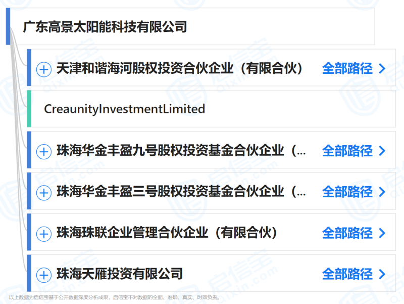今年3月5日,廣東高景的注冊資本增至約2.86億元。天津和諧海河股權投資合伙企業(yè)(有限合伙)(以下簡稱天津和諧海河)、珠海華金豐盈九號股權投資基金合伙企業(yè)(有限合伙)(以下簡稱豐盈九號)、珠海華金豐盈三號股權投資基金合伙企業(yè)(有限合伙)(以下簡稱豐盈三號)以及Creaunity Investment Limited(以下簡稱Creaunity)新增成為公司股東。