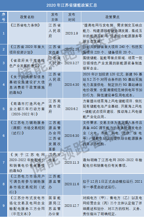 近兩年,江蘇省頻出新政支持儲能產(chǎn)業(yè)發(fā)展。據(jù)EESA不完全統(tǒng)計,2020年江蘇省共頒布9條與儲能相關性地方政策,通過地方性政策明確支持新能源與儲能的一體化建設。