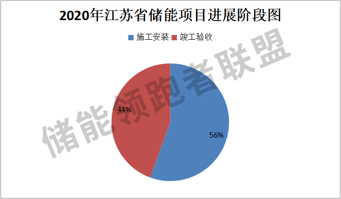 江蘇省已計入統(tǒng)計的18個儲能項目,處于施工安裝階段的儲能項目有10個,約占2020全年儲能項目總量的55.56%;處于竣工驗收階段的儲能項目有8個,約占2020全年儲能項目規(guī)??偭康?4.44%。
