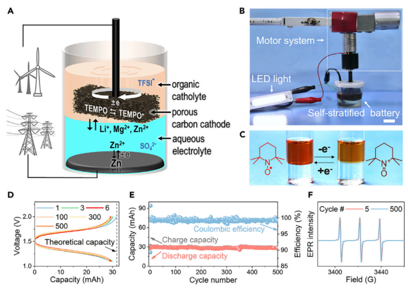 華中科技大學的研究人員提出了一種攪拌自分層液流電池(SSFB),它具有重力驅動的熱力學穩(wěn)定結構,底部含有Zn金屬陽極,中間含有水系電解液,頂部含有有機陰極電解液。正氧化還原物種(2,2,6,6-四甲基哌啶-1-氧[TEMPO]及其氧化狀態(tài))被溶解并嚴格限制在有機陰極電解液中。水系電解液層含有高濃度的無機鹽,但不含氧化物種。它將Zn陽極與氧化陰極分離。因此,自放電被消除,庫侖效率(CE)高于99%(500次循環(huán)),即使在攪拌加速充放電反應時也是如此。在循環(huán)過程中,SSFB在循環(huán)中保持了溶解氧化還原物種的良好穩(wěn)定性,就像傳統(tǒng)的RFB一樣。此外,SSFB本質上不受其他可充電電池的常見失效機制的影響,如電極晶體結構惡化、Zn的枝晶生長和膜交叉引起的問題。因此,它在長期循環(huán)過程中表現(xiàn)出良好的穩(wěn)定性。此外,Zn-TEMPO SSFB的能量密度可以與全釩液流電池媲美,是未來電力儲能應用理想的候選。