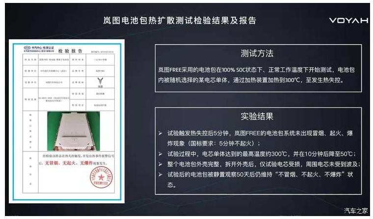 至于一些測(cè)試結(jié)果,嵐圖汽車稱嵐圖FREE電池包按照新國(guó)標(biāo)要求進(jìn)行熱擴(kuò)散試驗(yàn),在100%SOC狀態(tài)下、正常工作溫度下開始測(cè)試,電池包被隨機(jī)選擇的某電芯單體,通過加熱裝置加熱到300℃,至發(fā)生熱失控。結(jié)果是試驗(yàn)觸發(fā)熱失控5分鐘后,電池包系統(tǒng)未出現(xiàn)冒煙、起火、爆炸現(xiàn)象;試驗(yàn)過程中,電芯單體達(dá)到的最高溫度約300℃,并在10分鐘后降至50℃;整個(gè)電池包外殼完整,拆開外殼后,僅試驗(yàn)電芯受損,周圍電芯未受到波及;試驗(yàn)后的電池包被靜置觀察,50天后仍維持“不冒煙、不起火、不爆炸”狀態(tài)。