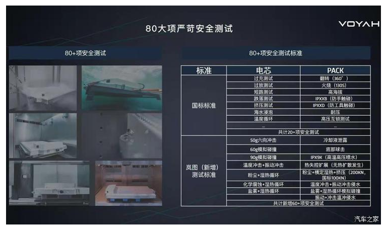 嵐圖汽車表示,其電池包經(jīng)過了“疊加測(cè)試”,例如同一塊電池包連續(xù)進(jìn)行高低溫存儲(chǔ)、極限溫度沖擊、等效45萬公里帶載振動(dòng)、六向機(jī)械沖擊、絕緣耐壓、泡水等測(cè)試;官方也舉例了一些具體測(cè)試,比如在高低溫環(huán)境濕熱循環(huán)及帶載下,同時(shí)實(shí)施振動(dòng)沖擊;有在鹽霧環(huán)境恒定濕熱下,同時(shí)打開濕熱環(huán)境循環(huán)充放電等等。