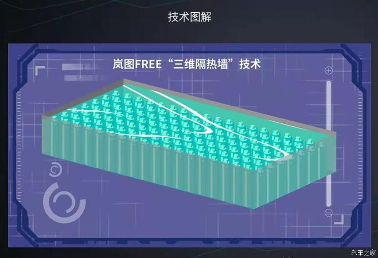 首先是“三維隔熱墻”,顧名思義它強(qiáng)調(diào)的就是“全方位隔熱”的能力;具體來說,嵐圖FREE動(dòng)力電池每個(gè)電芯都實(shí)現(xiàn)了單獨(dú)的三維立體包裹,“隔熱墻”在電芯與電芯之間形成了隔熱阻燃防護(hù)層,每個(gè)電芯均處于隔熱阻燃材料的包裹中,按照嵐圖汽車的說法,即便某個(gè)電芯單體發(fā)生熱失控,“隔熱墻”也能使其釋放的能量最小化,避免波及到周圍其它電芯,從而防止電池包發(fā)生熱失控。