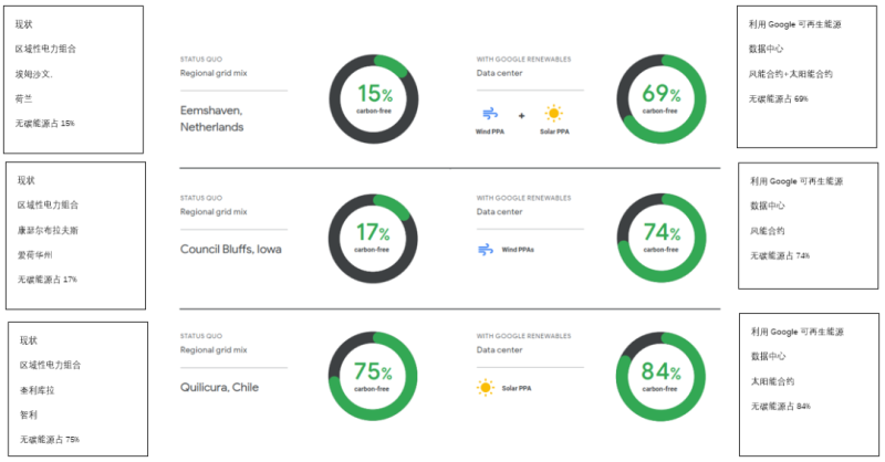 1、對采購可再生能源所做出的努力(匹配每年100%的用電量)邁向全天候24x7無碳能源取得了有意義的進(jìn)步。 自2010年以來,通過在各個數(shù)據(jù)中心區(qū)域增加25個以上的風(fēng)能和太陽能項(xiàng)目(總發(fā)電容量超過3GW),大大提高了數(shù)據(jù)中心每小時負(fù)載與區(qū)域無碳能源供應(yīng)之間的匹配水平。圖1重點(diǎn)介紹了一些來自全球各地的案例。在所有已簽署可再生能源合約的數(shù)據(jù)中心區(qū)域中,2017年Google數(shù)據(jù)中心每小時用電量至少有65%與無碳能源相匹配。