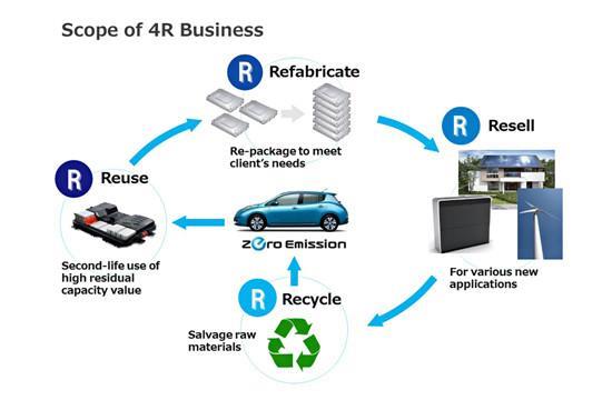 2010年,日產汽車與住友商事株式會社(Sumitomo Corp.)成立合資企業(yè)4R Energy株式會社(4R Energy Corp.),專注于電動汽車電池的有效再利用,并通過開發(fā)技術和基礎設施,以4R模式(再制造(refabricate),再循環(huán)(recycle),再銷售(resell)和再利用(reuse)),發(fā)掘車載電池能量價值為其他設施提供電力。