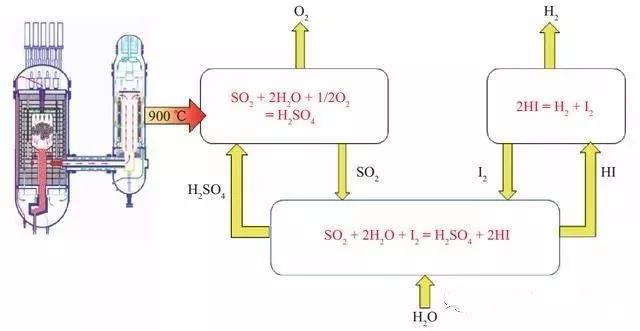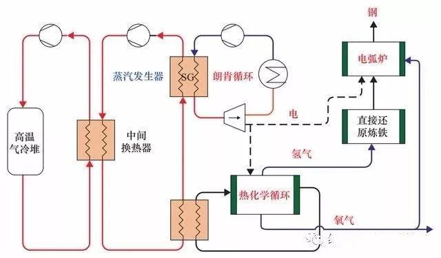 此處的核冶金是技術(shù)的亮點(diǎn)——就是利用核能制氫再用氫氣冶金。要實(shí)現(xiàn)核能到氫能的高效轉(zhuǎn)化,必須部分或全部利用以反應(yīng)堆提供的工藝熱,減少熱–電轉(zhuǎn)換過程中的效率損失。主流的核能制氫技術(shù)包括熱化學(xué)循環(huán)(碘硫循環(huán)、混合硫循環(huán))和高溫蒸汽電解。