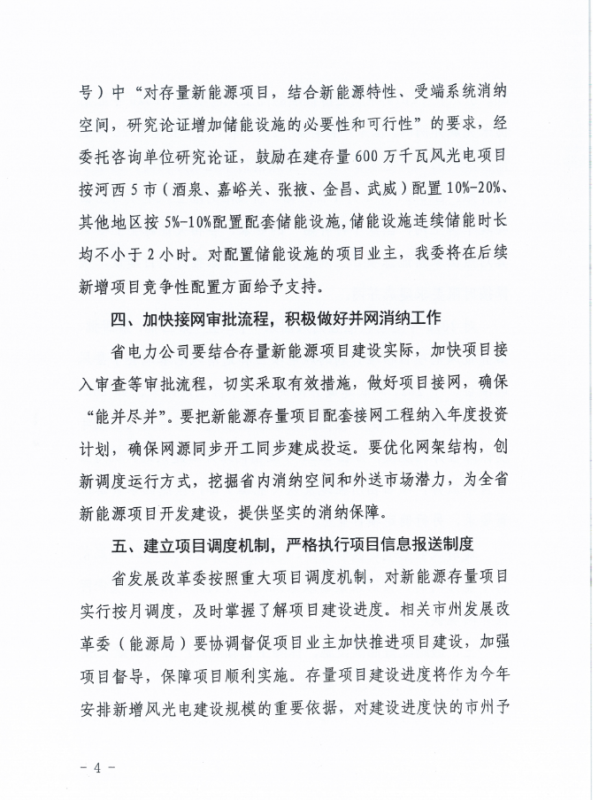 此外,文件還明確鼓勵(lì)配置儲(chǔ)能設(shè)施,鼓勵(lì)全省在建存量600萬千瓦風(fēng)光電項(xiàng)目按河西5市(酒泉、嘉峪關(guān)、張掖、金昌、武威)配置10%-20%、其他地區(qū)按5%-10%配置配套儲(chǔ)能設(shè)施,儲(chǔ)能設(shè)施連續(xù)儲(chǔ)能時(shí)長(zhǎng)均不小于2小時(shí)。對(duì)配置儲(chǔ)能設(shè)施的項(xiàng)目業(yè)主,甘肅省發(fā)改委將在后續(xù)新增項(xiàng)目競(jìng)爭(zhēng)性配置方面給予支持。